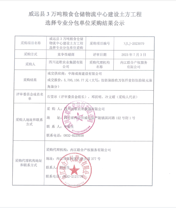 威遠縣3萬噸糧食倉儲物流中心建設土方工程選擇專業(yè)分包單位采購結果公示