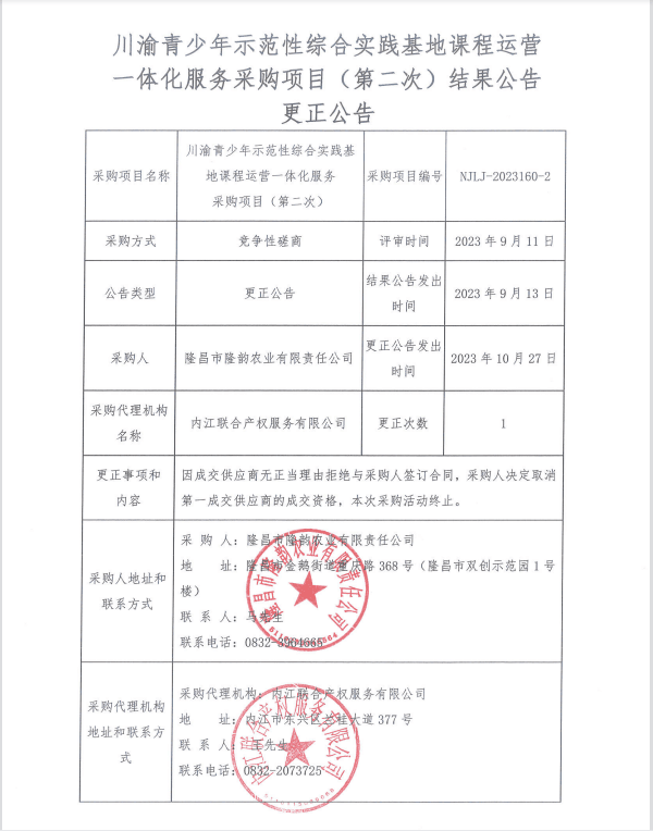 川渝青少年示范性綜合實(shí)踐基地課程運(yùn)營一體化服務(wù)采購項(xiàng)目(第二次)結(jié)果公告更正公告