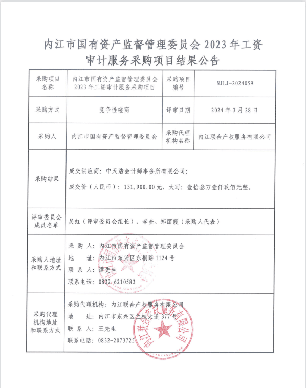 內(nèi)江市國有資產(chǎn)監(jiān)督管理委員會2023年工資審計服務(wù)采購項目結(jié)果公告