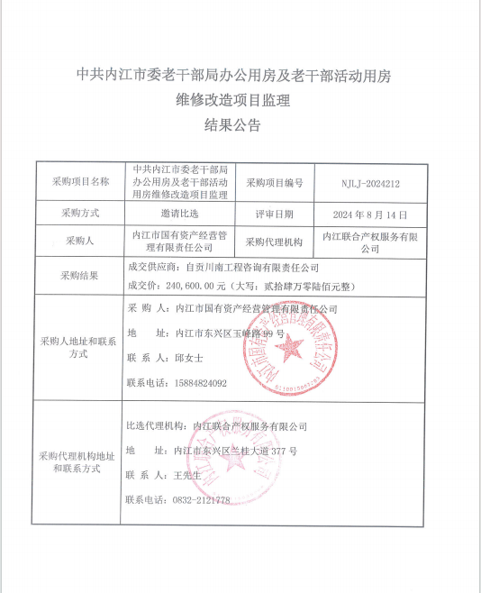 中共內(nèi)江市委老干部局辦公用房及老干部活動用房維修改造項目監(jiān)理結(jié)果公告